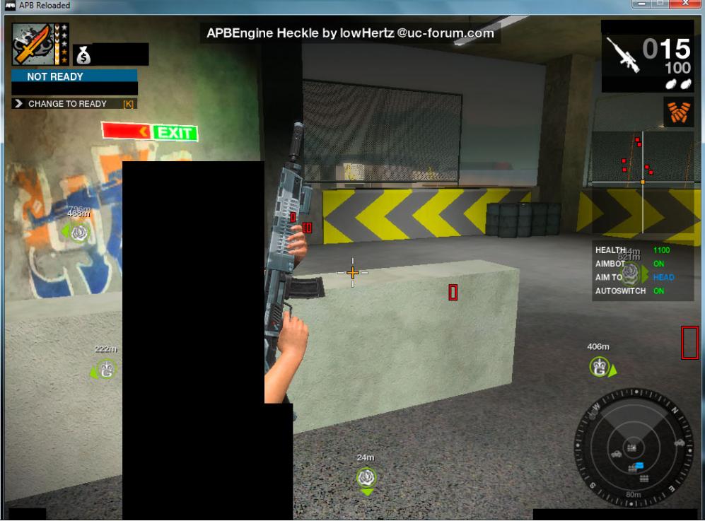 Горячие клавиши: LSHIFT = Aimbot (Left shift) F2 = Change the spot to aim F3 = Enable/Disable the Autoswitch F4 = Enable/Disable the Aimbot DELETE = Unload the hack Инструкция: Запустить игру и зайти на сервер Свернуть игру Запустить Winject.exe В верхней строке выбрать процесс игры APB В нижней файл чита APBEngine.dll Нажать Inject Вернуть в игру
